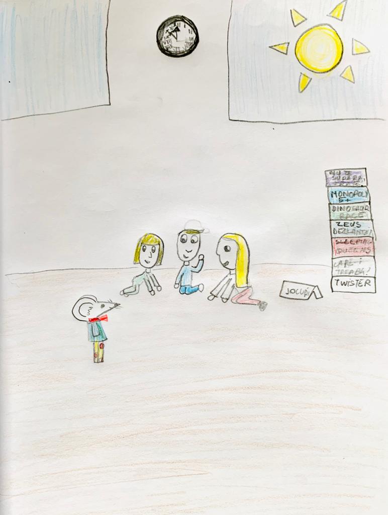 Și tot pe scrisoare copiii au desenat o familie cu trei copii jucându-se cu un șoricel. Soarele lumina vesel pe fereastă iar ceasul de pe perete arăta ora 10:00. Ideea cu ceasul a avut-o băiețelul, i se părea amuzant să își imagineze cât mai precis momentul întâlnirii.